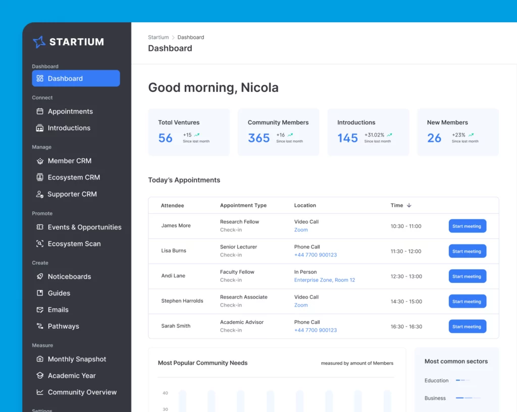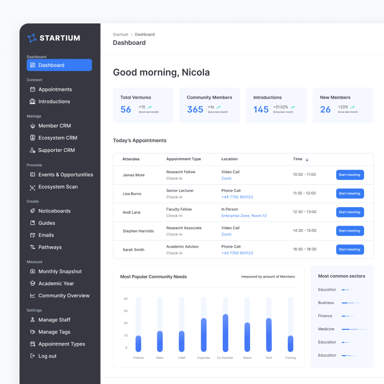 By combining engagement, activity and ecosystem data, Startium provides personalised recommendations, surfaces opportunities and guides founders to the right resources at the right time.